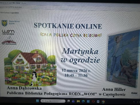 | | CAŁA POLSKA CZYTA DZIECIOM Uczniowie z klasy 1-3 uczestniczyli w spotkaniu czytelniczym on-line „Martynka w ogrodzie” Gilberta Delahaye w tłumaczeniu Wandy Chotomskiej z ilustracjami Marcela Marlier, zorganizowanym przez Publiczną Bibliotekę RODN „WOM” w Częstochowie. Podczas zajęć dzieci rozwijały i utrwalały wiedzę na temat wiosny. Rozmawiały o oznakach tej pory roku, zmianach zachodzących w przyrodzie oraz o tym, jak zmienia się pogoda. Dzieci poznawały także wiosenne kwiaty, zwierzęta budzące się po zimie oraz ptaki powracające z ciepłych krajów. Zajęcia sprzyjały rozwijaniu ciekawości przyrodniczej oraz poszerzaniu wiedzy o otaczającym świecie.
