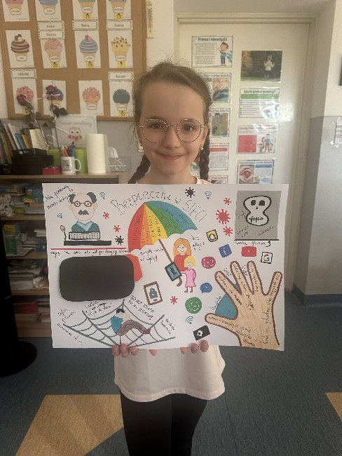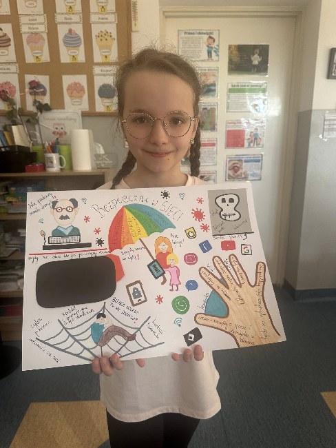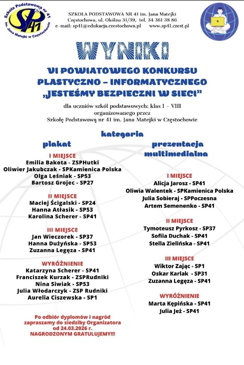 | | Kolejny powód do dumy! Nasza uczennica z klasy 3 Emilia Bakota, odniosła kolejny sukces, tym razem w VI Powiatowym Konkursie Plastyczno-Informatycznych „Jesteśmy bezpieczni w sieci”, którego organizatorem była Szkoła Podstawowa nr. 41 im. Jana Matejki w Częstochowie, osiągając 1 miejsce. Jej kreatywność, zaangażowanie i wrażliwość na ważne tematy zaowocowały wspaniałym osiągnięciem. Serdecznie gratulujemy i życzymy dalszych sukcesów oraz nieustającej pasji do tworzenia! Brawo!